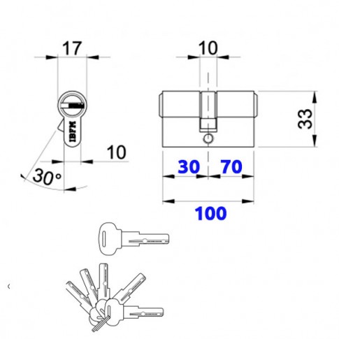 Cylindre de sécurité à deux entrées (on peut utiliser une clé des deux côtés) et à 6 goupilles avec protection anti-perçage et anti-effraction. Clés spéciales. Finition : nickelé Livré avec 5 clés réversibles à points et une clé de chantier (celle ci sert durant le chantier uniquement: Une fois que l'on fait tourner une clé principale, la clé de chantier ne peut plus ouvrir)