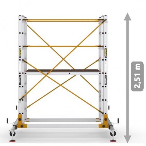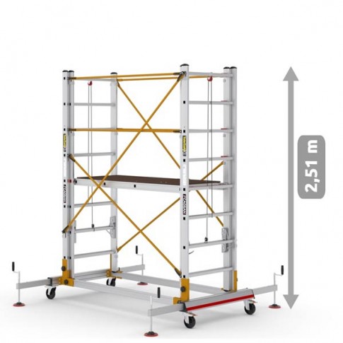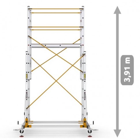 Les échafaudages en aluminium en deux parties TeleSafe XL_FP sont des échafaudages mobiles. Le système de verrouillage Q-Lock développé pour une installation rapide est utilisé. Les hauteurs de la plate-forme et de l'échafaudage peuvent être facilement ajustées grâce aux systèmes de corde et de poulie. Les roues verrouillables et les stabilisateurs en acier minimisent le balancement.