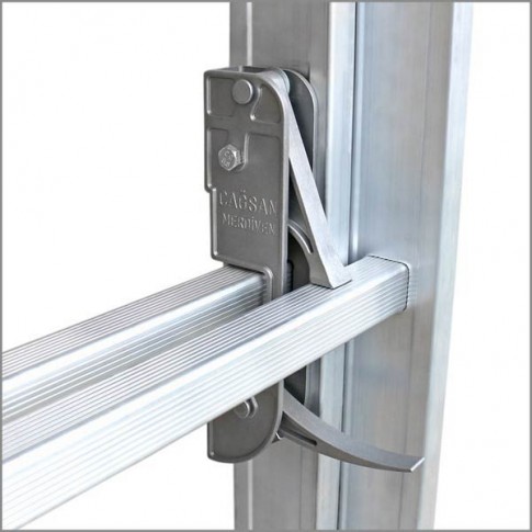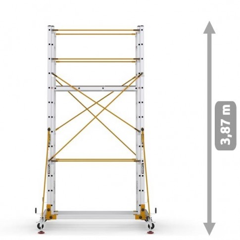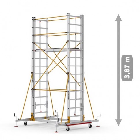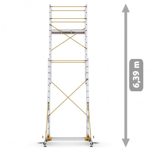 Les échafaudages en aluminium en deux parties TeleSafe XL_FP sont des échafaudages mobiles. Le système de verrouillage Q-Lock développé pour une installation rapide est utilisé. Les hauteurs de la plate-forme et de l'échafaudage peuvent être facilement ajustées grâce aux systèmes de corde et de poulie. Les roues verrouillables et les stabilisateurs en acier minimisent le balancement.