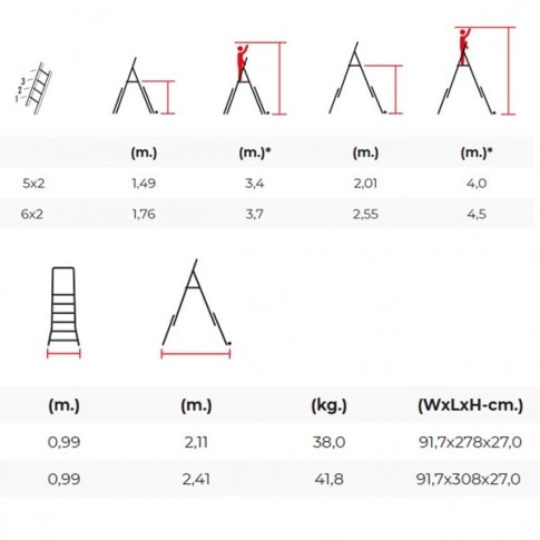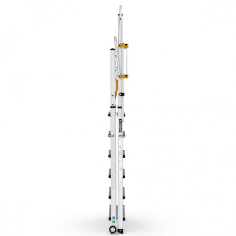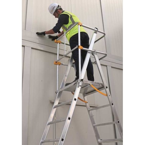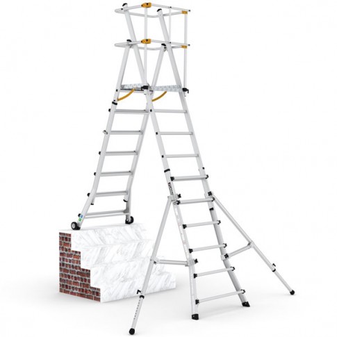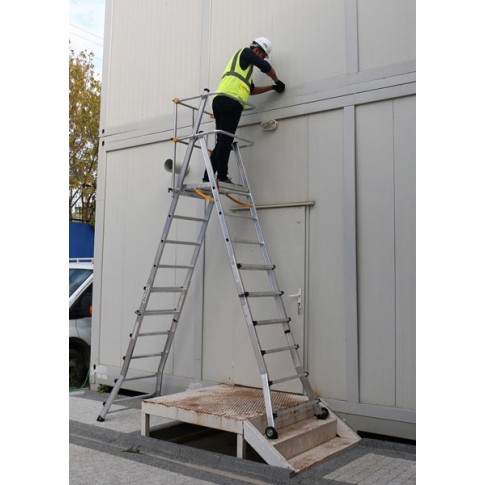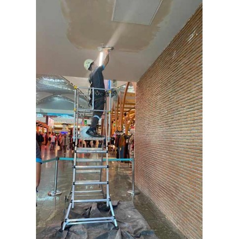 Plates-formes industrielles en aluminium de la famille TELEPRO qui sont télecopiques et qui permettent de varier l'hauteur de la plateforme et d'atteindre des hauteurs de travail de 4,50 mètres. Plateforme en aluminium parfaitement sécurisée.