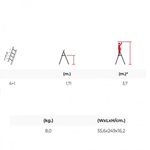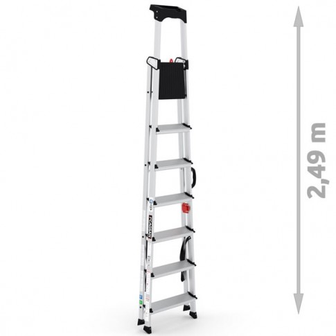 Escabeau à 6 marches + Plateforme entièrement en Aluminium destiné à un usage professionnel. Permet d'atteindre une hauteur de travail de 3,7m. Marches anti dérapantes et embouts stabilisateurs. Muni d'une poignée de transport et d'un verrou. Léger, solide et confortable il est indispensable pour tous vos travaux.