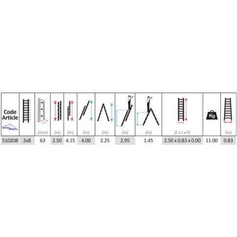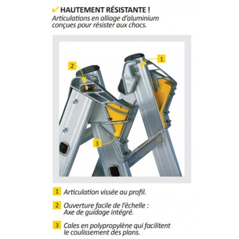 Echelle escabeau télescopique à 2 x 8 marches de la gamme professionnelle de CENTAURE FRANCE et de longueur maximale 4.15 mètres. Robuste car fabriqué en alliage d'aluminium avec forme de profilé fermé.