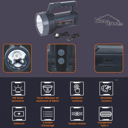 Lampe torche LED rechargeable. Se charge sur une prise USB. 3 fonctions avec lumière clignotante