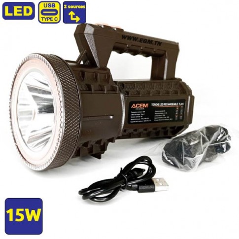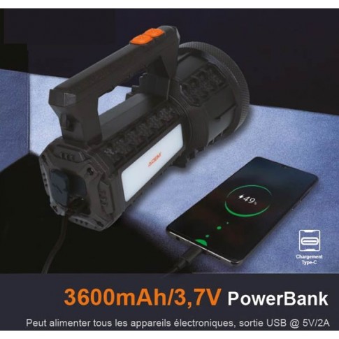 Lampe torche LED rechargeable avec double illumination (mode torche ou mode COB). Se charge sur une prise USB Type-C
