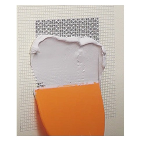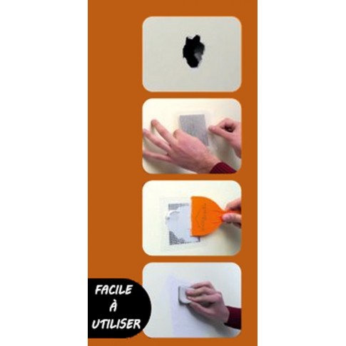 Kit de réparation pour murs intérieurs en plâtre, béton, bois, stucco, etc. contenant tout le nécessaire pour effectuer la réparation. Permet de réparer des fissures et trous de taille petites et moyennes. Peut être vernis ou peint