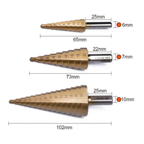 Jeu de 3 Fraises à étages à queue cylindrique allant d'un diamètre de 4mm jusqu'à 32mm. Convient pour les métaux non ferreux, la tôle d’acier, le bois et le plastique Pas besoin d'avant-trou dans les tôles minces, pas de bavures ni de formation d'arête rapportée. Est utile pour percer des trous de différents diamètres avec une seule mèche, l'ébavurage des trous, agrandir des trous existants, etc.