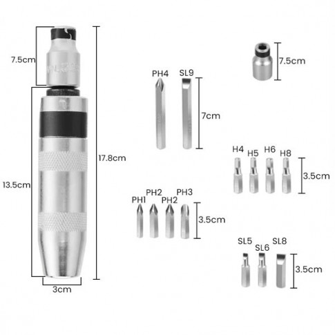 Tournevis à frapper en Acier Cr-V résistant aux impacts. Fourni avec 13 embouts: