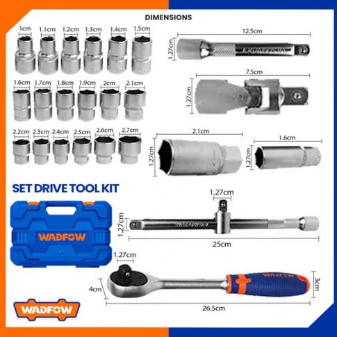 Coffret de bricolage de 24 pièces de 1/2" en Chrome-Vanadium et surfaces micro finies. Douilles allant de 10mm à 32mm. Contient tout ce dont a besoin le bricoleur dans une mallette de rangement en ABS.