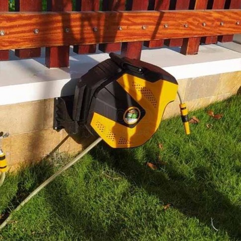 Porte-tuyau mural avec enrouleur automatique et support mural. le dévidoir peut pivoter à 180°, empêchant au tuyau de se tordre ou de s'emmêler en arrosant. Le dévidoir peut se rabattre sur le mur pour le réduire l'encombrement de stockage.