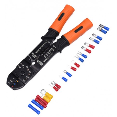 Coffret avec pince multi-usages pour éléctricien: Sert à dénuder les fils, couper les fils et sertir les connecteurs isolés et non isolés. Contient également un ensemble de connecteurs ainsi que des gaines thermo retractables. Repères de couleur pour le choix de la cosse - Rouge pour les cosses des fils de 0.5 à 1.5 mm - Bleu pour les cosses des fils de 1.5 à 2.5 mm - Jaune pour les cosses des fils de 4 à 6 mm. . Manche gainé pour plus de confort.