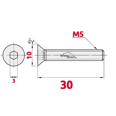 Pack contenant 10 Vis à métaux tête fraisée hexagonale creuse M5x30 DIN7991 en acier inoxydable A2, selon la norme DIN 934. Indiqué pour installations extérieures, industrielles et environnements corrosifs (exempt de chlore)