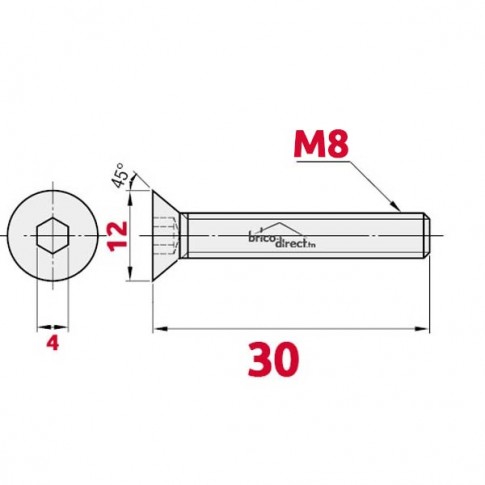 Pack contenant 4 Vis à métaux tête fraisée hexagonale creuse M8x30 DIN7991 en acier inoxydable A2, selon la norme DIN 934. Indiqué pour installations extérieures, industrielles et environnements corrosifs (exempt de chlore)