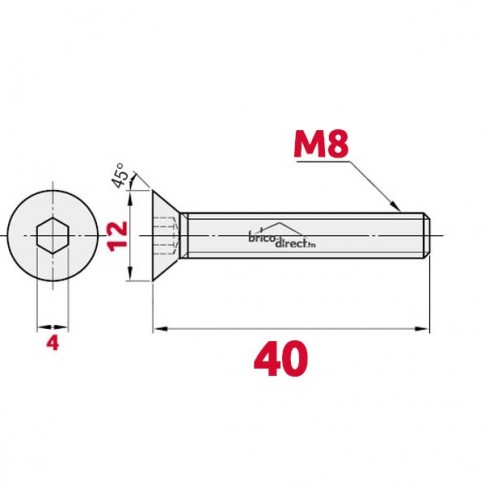 Pack contenant 5 Vis à métaux tête fraisée hexagonale creuse M8x40 DIN7991 en acier inoxydable A2, selon la norme DIN 934. Indiqué pour installations extérieures, industrielles et environnements corrosifs (exempt de chlore)